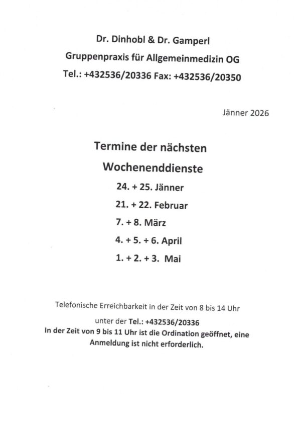 Wochenenddienste Dr. Dinhobl/Dr. Gamperl Lukas Bock2026-01-08T19:38:05+01:008. Januar 2026| Teile diesen Beitrag in den sozialen Medien! FacebookXPinterestE-Mail